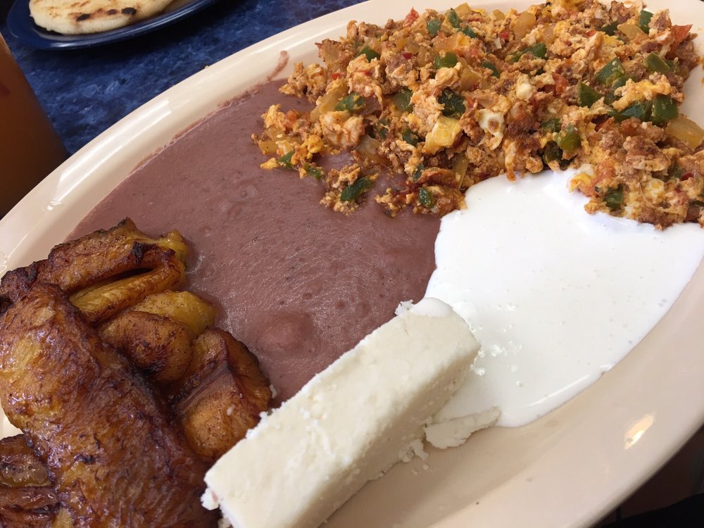 A combination of our typical salvadoran food, served with sausage, refried beans, rice eggs, sour cream, fried plantain, and avocado