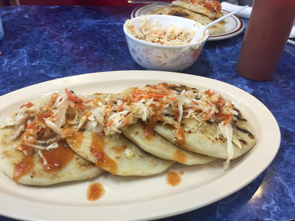 Corn tortilla filled with cheese, pork meat or beans. Served with marinated cabbage and salsa